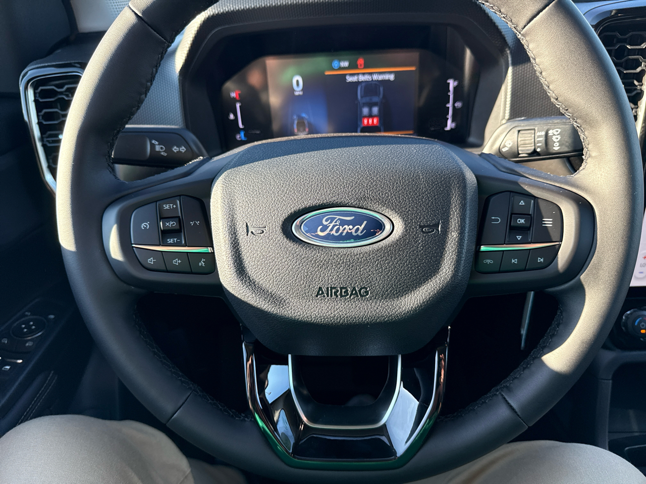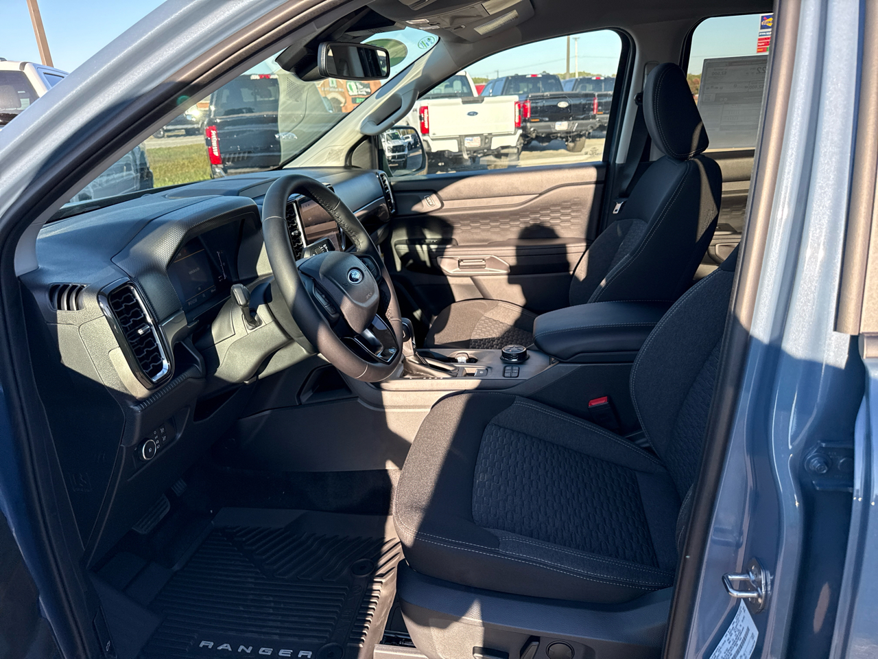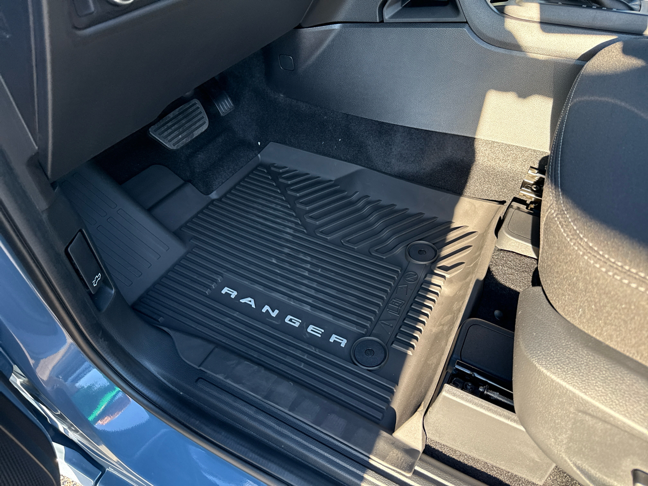 The exterior boasts a rugged yet modern design, with a sport box decal, automatic high beams, and LED brakelights for added safety. Inside, the Ranger offers a comfortable and connected driving experience with streaming audio, real-time traffic display, and a driver information center. The spacious cabin features premium materials, a leather-wrapped steering wheel, and ample storage options throughout.